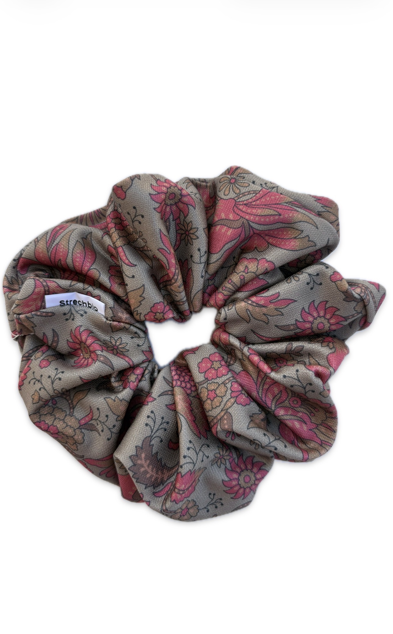 Γυναικεία Χειροποίητα Scrunchies – λαστιχάκια μαλλιών, σε σχέδιο : Λαδί – κόκκινα λουλούδια